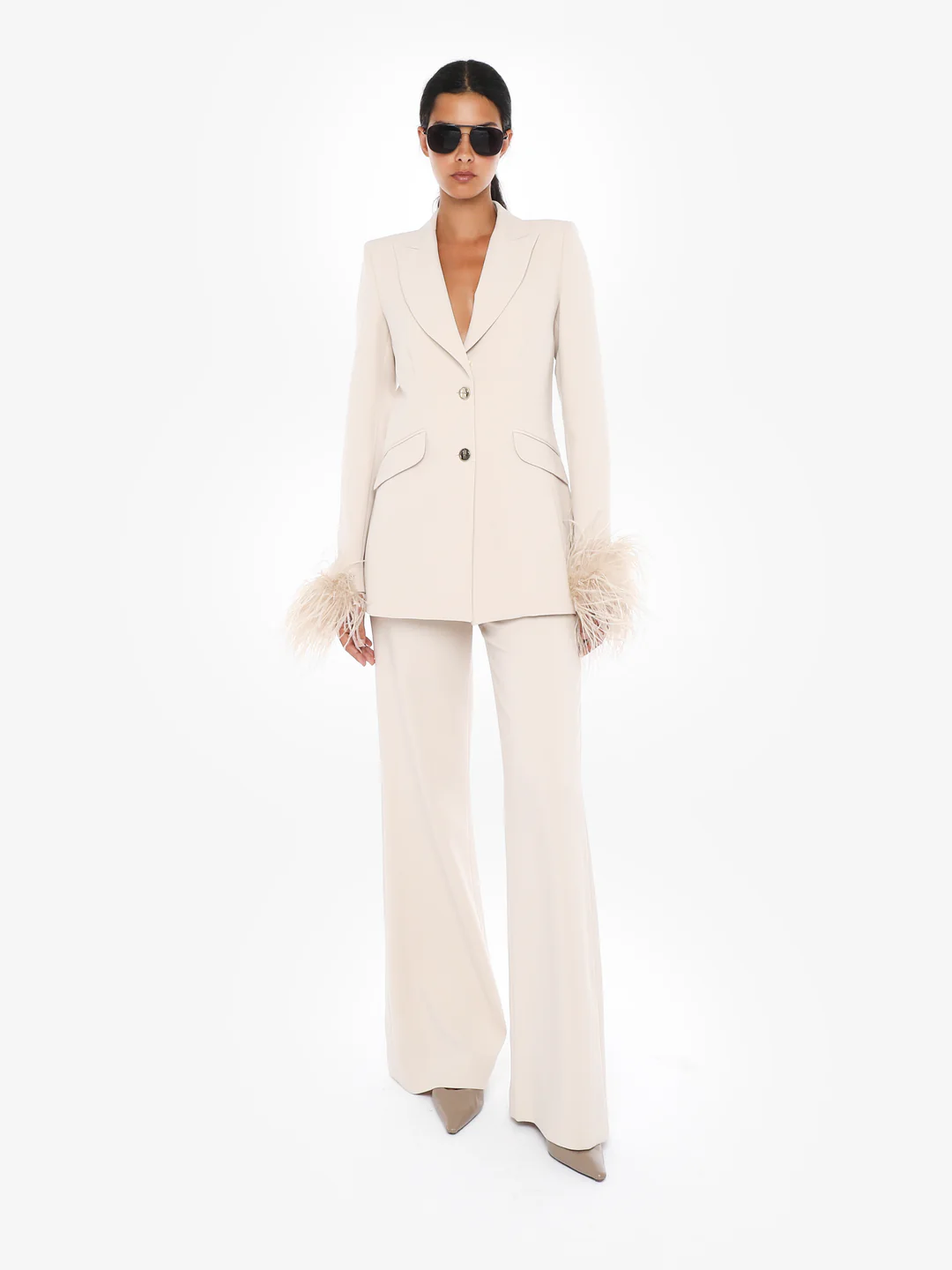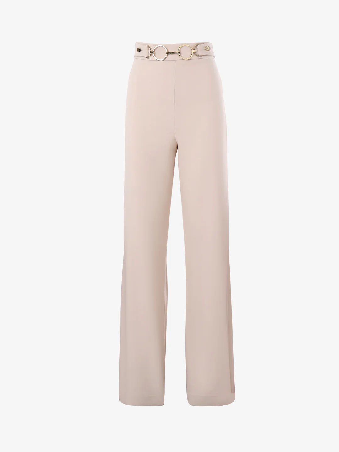 Presenta una vestibilità aderente sui fianchi che si allarga gradualmente verso il basso, creando una silhouette fluida e sofisticata. La caratteristica distintiva di questi pantaloni è la cintura decorativa in vita, dotata di grandi anelli metallici connessi da cinghie, che aggiungono un tocco di design contemporaneo e industriale. Il design pulito e la colorazione neutra rendono questi pantaloni estremamente versatili. La modella indossa una taglia 40 ed è alta 170cm. Si consiglia un lavaggio ed una stiratura a media temperatura. Stagione autunno inverno.