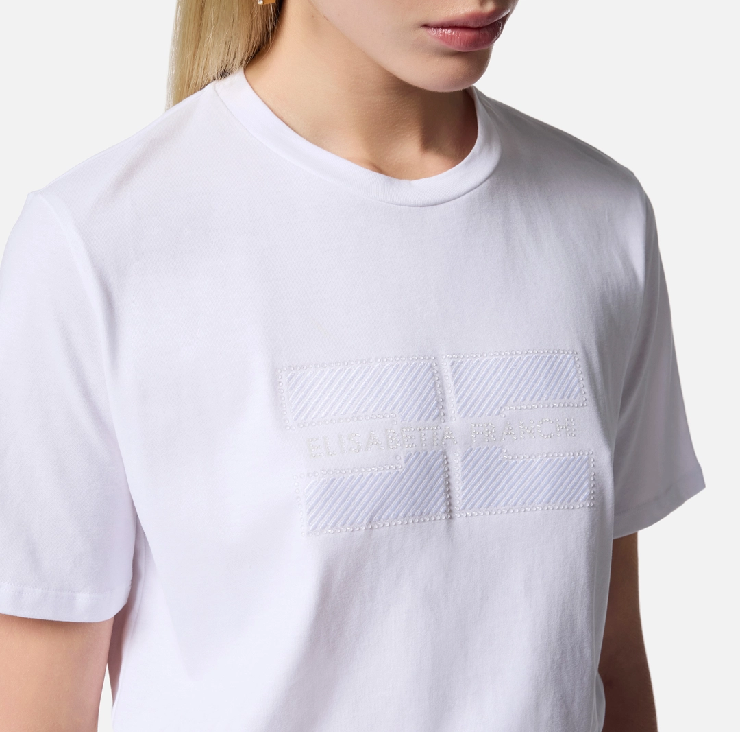 Maglietta a maniche corte in jersey di cotone con vestibilità regular. Il capo è impreziosito dal logo frontale, ottenuto con ricami in filo e infine illuminato da una essenziale cornice di strass trasparenti.